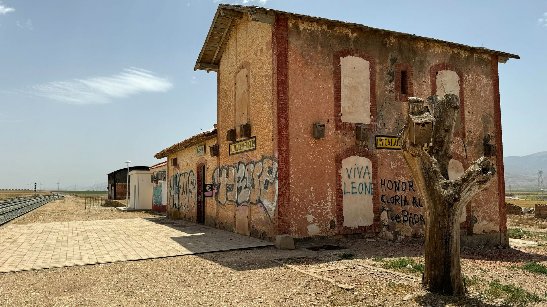 8/1/2024 - Sergio Leone movies location. A weathered, abandoned building covered in colorful graffiti sits adjacent to a railway platform in a dry landscape.