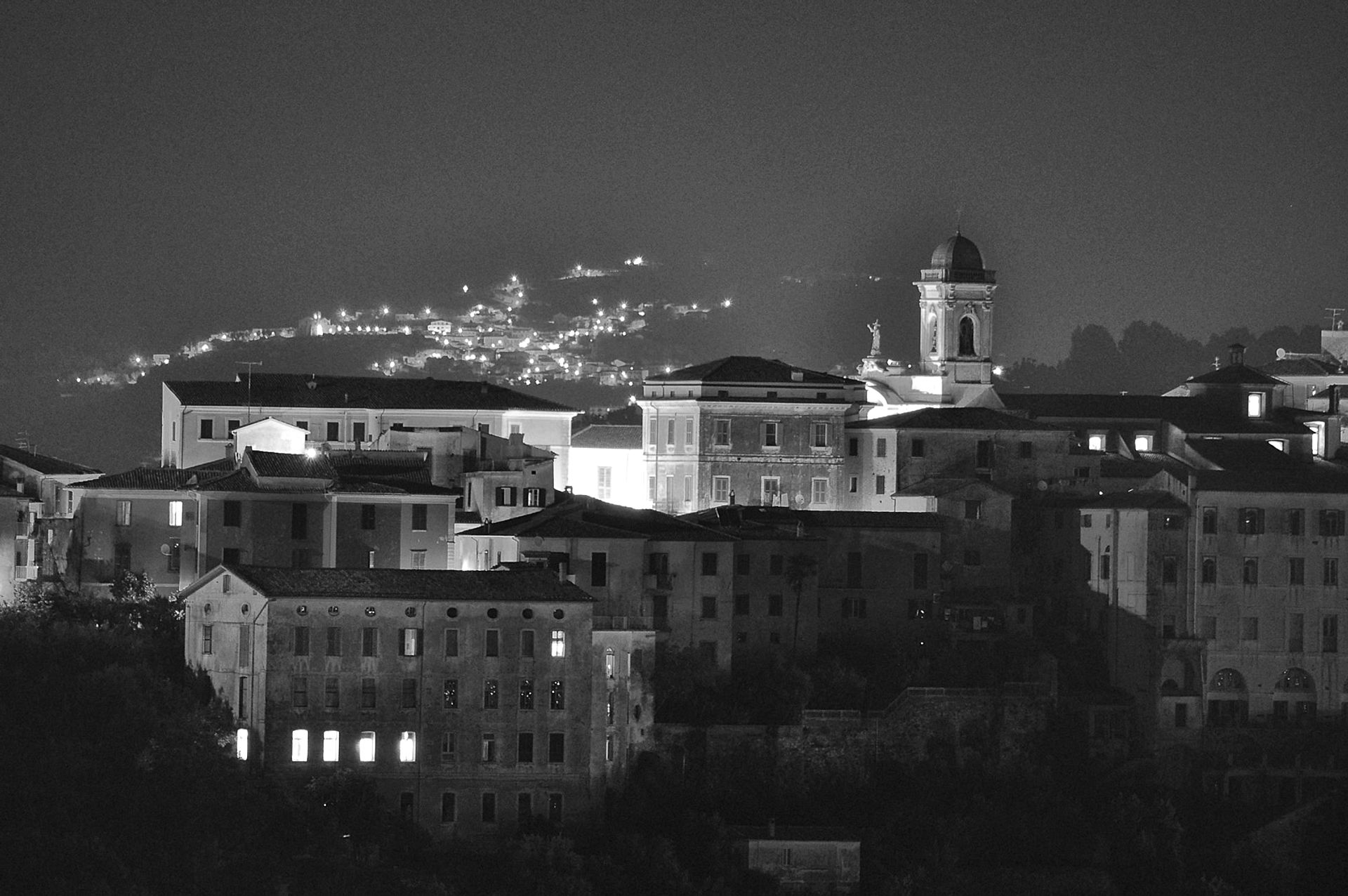 15/08/2010 - Monochrome night view of a historic village with distant lights on the hills.