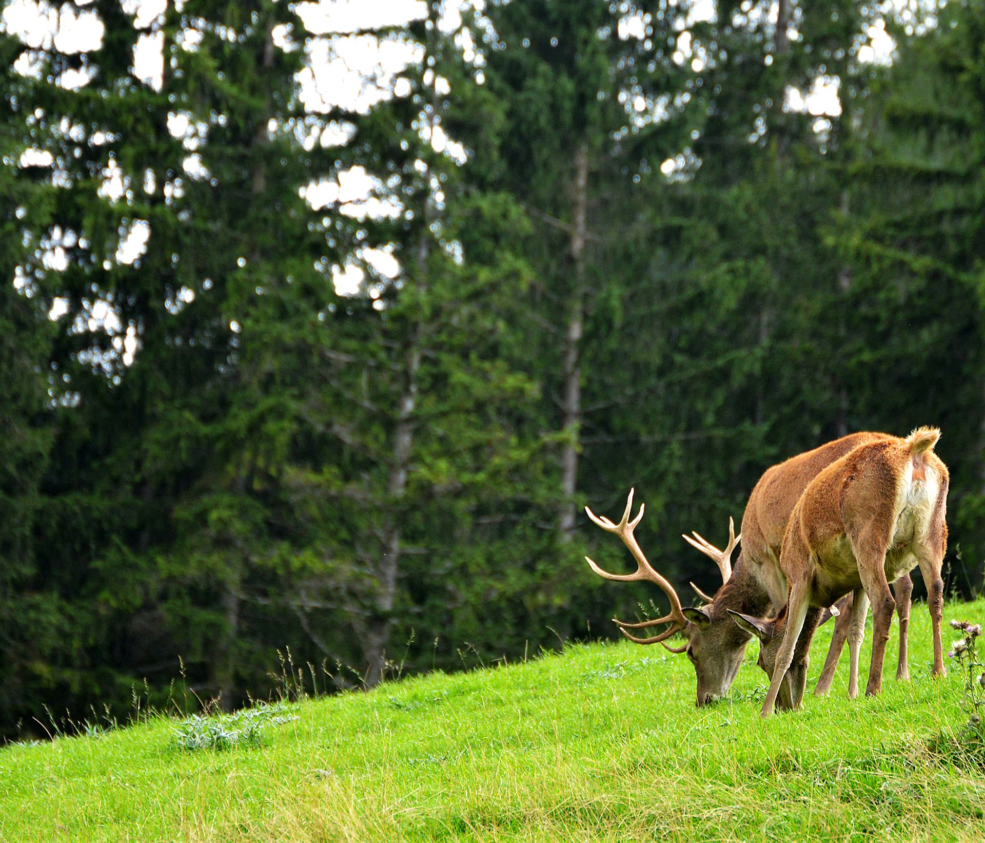 21/08/2015 - Two deer graze peacefully on a green meadow at the edge of a dense coniferous forest.